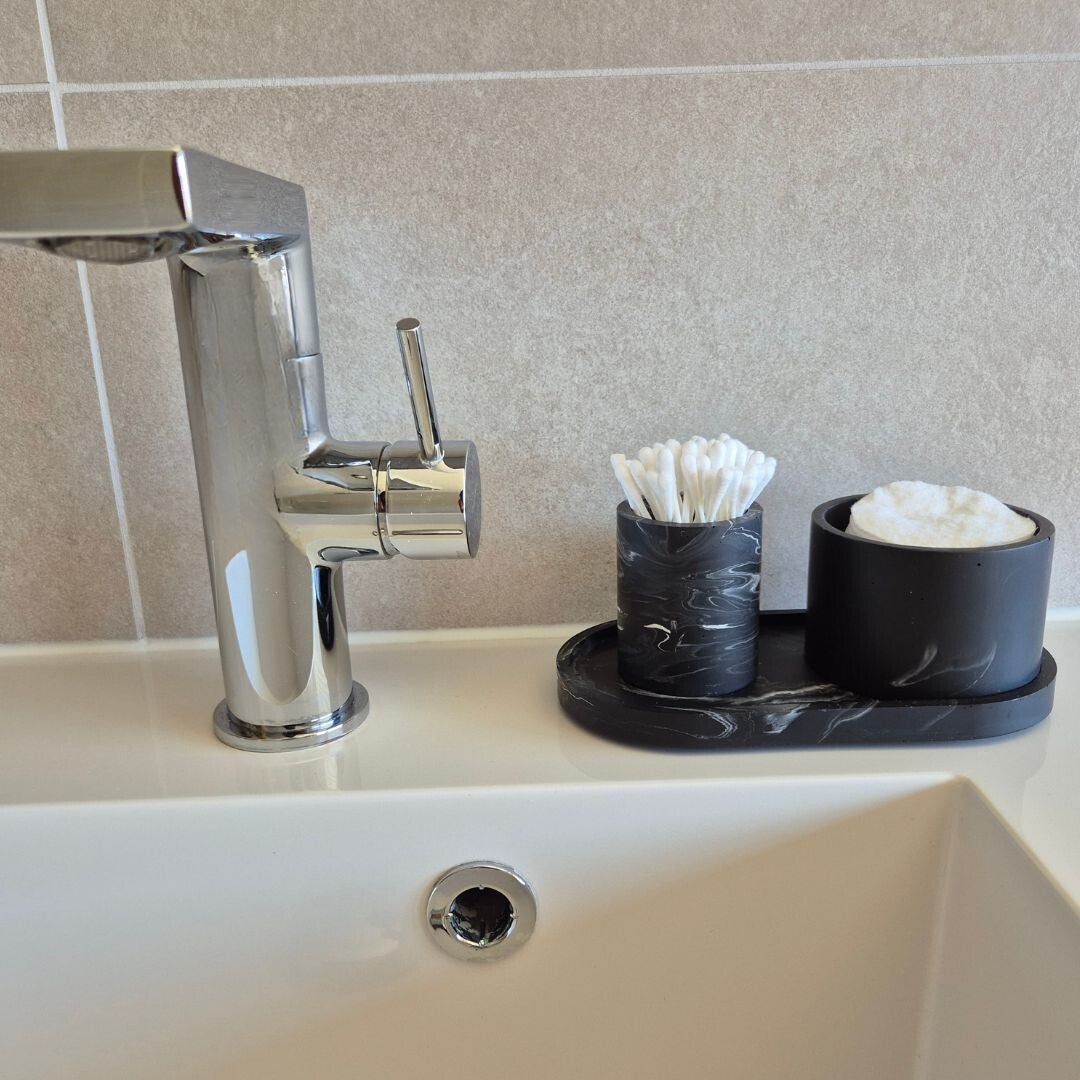 Stijlvol en praktisch setje in zwart met wit marmer voor watjes en wattenstaafjes. Gemaakt van acrylic resin met betonlook, waterafstotend laagje en rubberen voetjes. Een luxe en functionele toevoeging aan je badkamer.