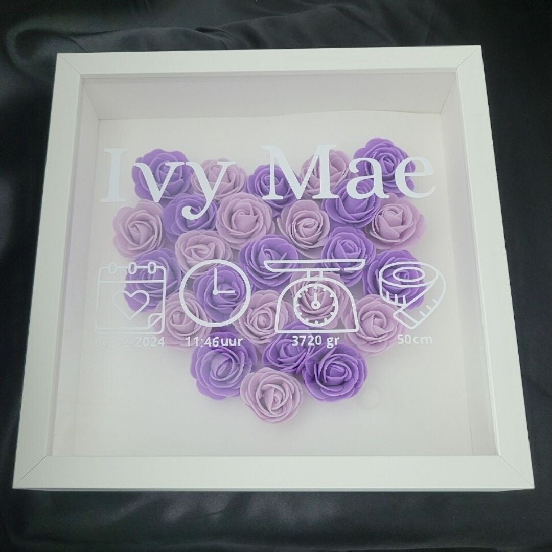 Deze witte geboortebox met een hartvorm van zachte kunstrozen in verschillende kleuren verkrijgbaar is een prachtig en persoonlijk cadeau voor de geboorte van een kindje. Stijlvol, liefdevol en helemaal op maat gemaakt.