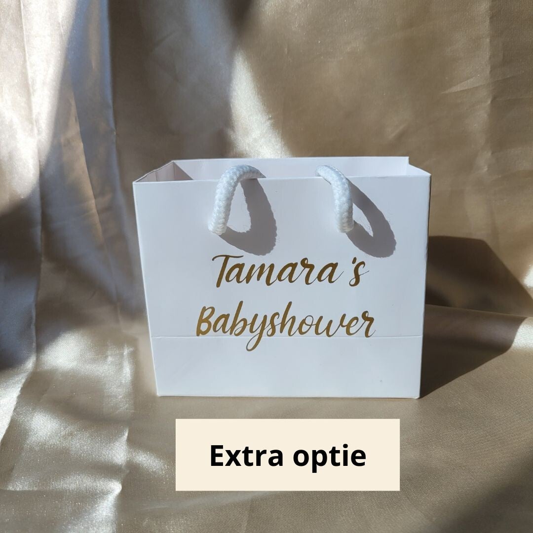 - Extra optie mogelijk: een gepersonaliseerd tasje, zie foto.