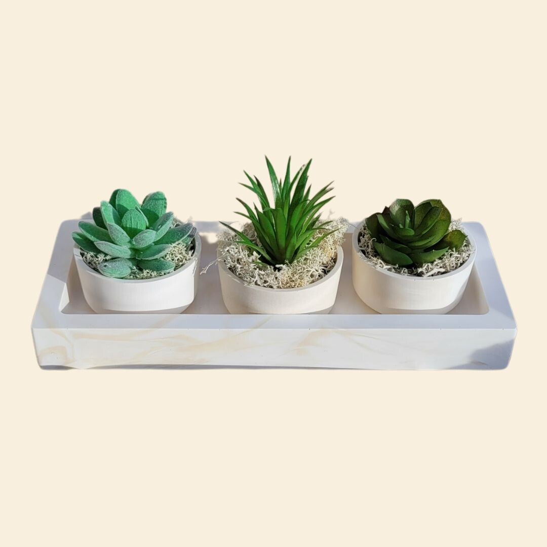 Breng sfeer en een modern accent in je interieur met deze handgemaakte acrylic resin tray. De drie potjes met kunstvetplantjes zorgen voor een frisse uitstraling, zonder onderhoud. Mooi te stylen op een dressoir, tafel of in de vensterbank.