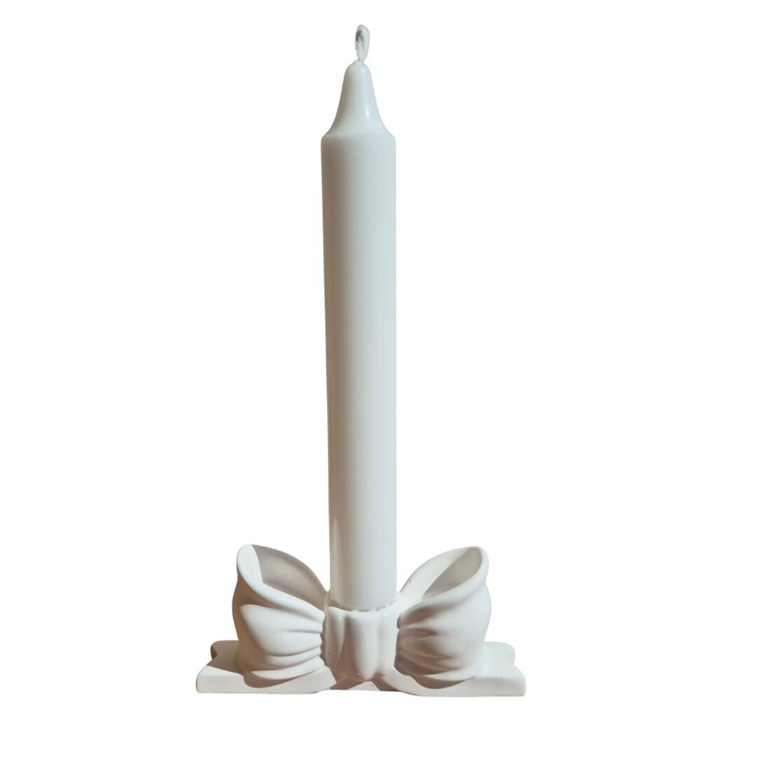 Een elegante, handgemaakte witte kaarshouder in strikvorm die zorgt voor een frisse en tijdloze look. Wordt geleverd met dinerkaars en kaart naar keuze, waardoor het een prachtig en persoonlijk cadeau is. Mooi in elk interieur.